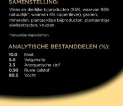 Een hond van 5 kg heeft 2,5 kuipje per dag nodig, een hond van 7 kg 3 kuipjes per dag, een hond van 10 kg 4 kuipjes per dag. Het is aanbevolen om een mix van droge en natte voeding te geven. Bekijk productspecificaties voor de samenstelling per smaak.