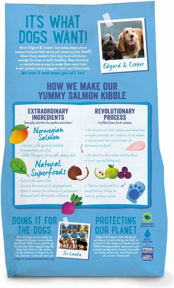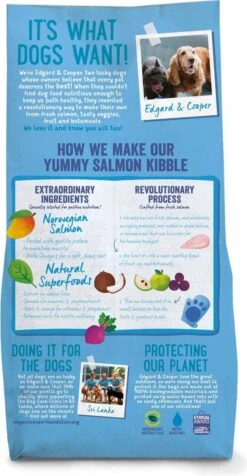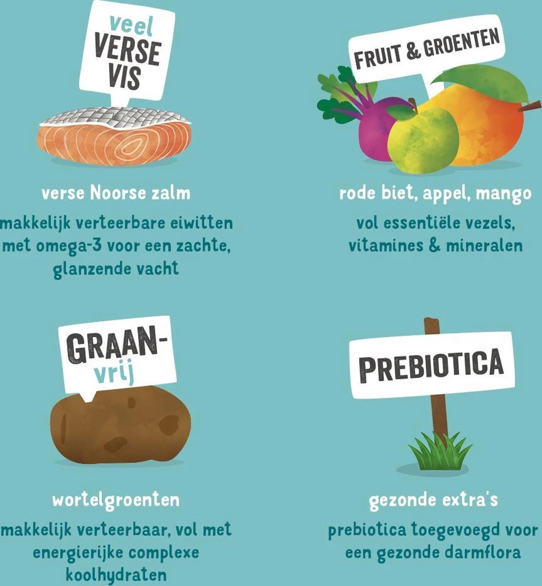 Dit recept met véél verse Noorse zalm (en géén gedroogde of gedehydreerde zalm (Alt. vis)) zit vol omega 3 en hoogwaardige eiwitten. En prebiotica voor een gezonde darmflora. Deze brokken zijn graanvrij en hypoallergeen, ideaal dus voor gevoelige maagjes. Al onze recepten bevatten een supergezonde mix van fruit en groenten. En lekkere kruiden en botanicals voor een extra boost. Die fantastische blend bakken we langzaam: zo blijft al dat goede perfect bewaard.