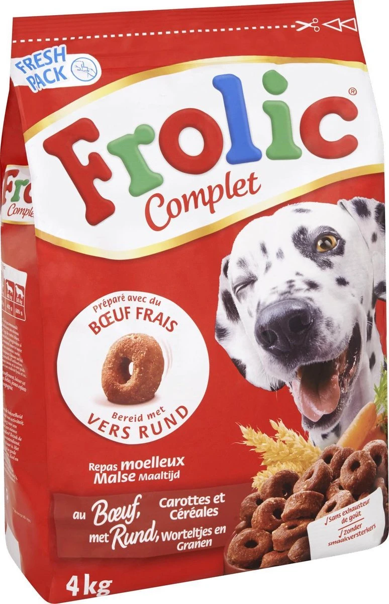 Frolic voorziet ‘met ieder rondje’ in de dagelijkse behoeftes van jouw hond. Deze complete droogvoeding is heerlijk mals en zit vol met smakelijk vers vlees, groenten, granen, vitaminen en mineralen.