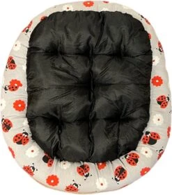 De hondenmand beschikt over een lichtbruin oppervlak . De bodem is bedekt met lieveheersbeestjes met eromheen kleuren als wit, rood en zwart. De achtergrond van de bodem heeft een grijze tint met rode stippen.