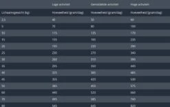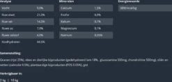 Vocht 9.0%, Ruw eiwit 21.0%, Ruw vet 14,5%, Ruwe as 7.0%, Ruwe celstof 4.0%, Calcium 1.5%, Fosfor 0.9%, Kalium 0.7%, Magnesium 0.1%, Natrium 0.35%.