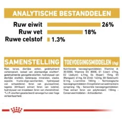 | Analytische bestandsdelen | Analyse: Eiwitten: 26.00% – Ruw vet: 18.00% – Ruwe as: 5.50% – Ruwe celstof: 1.30% – Vocht: 9.50% |