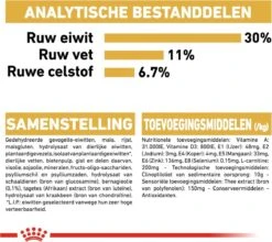 | Voedingswaarde | Samensteling: gedehydreerde gevogelte-eiwitten, maïs, rijst, maïsgluten, plantaardige vezels, hydrolysaat van dierlijke eiwitten, isolaat van plantaardige eiwitten*, dierlijke vetten, bietenpulp, gist, mineralen, visolie, sojaolie, psylliumschil en psylliumzaden, Fructo-Oligo-Sacchariden, hydrolysaat van schaaldieren (bron van glucosamine), bernagieolie (0.1%), extracten uit groene thee en druiven (bron van polyfenolen), tagetes (Afrikaan) extract (bron van luteïne), hydrolysaat van kraakbeen (bron van chondroïtine) |