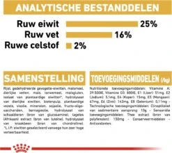 | Analytische bestandsdelen | Analyse: Ruw eiwit: 25.00% – Ruw vet: 16.00% – Ruwe as: 5.60% – Ruwe celstof: 1.90% – Vocht: 9.50% |