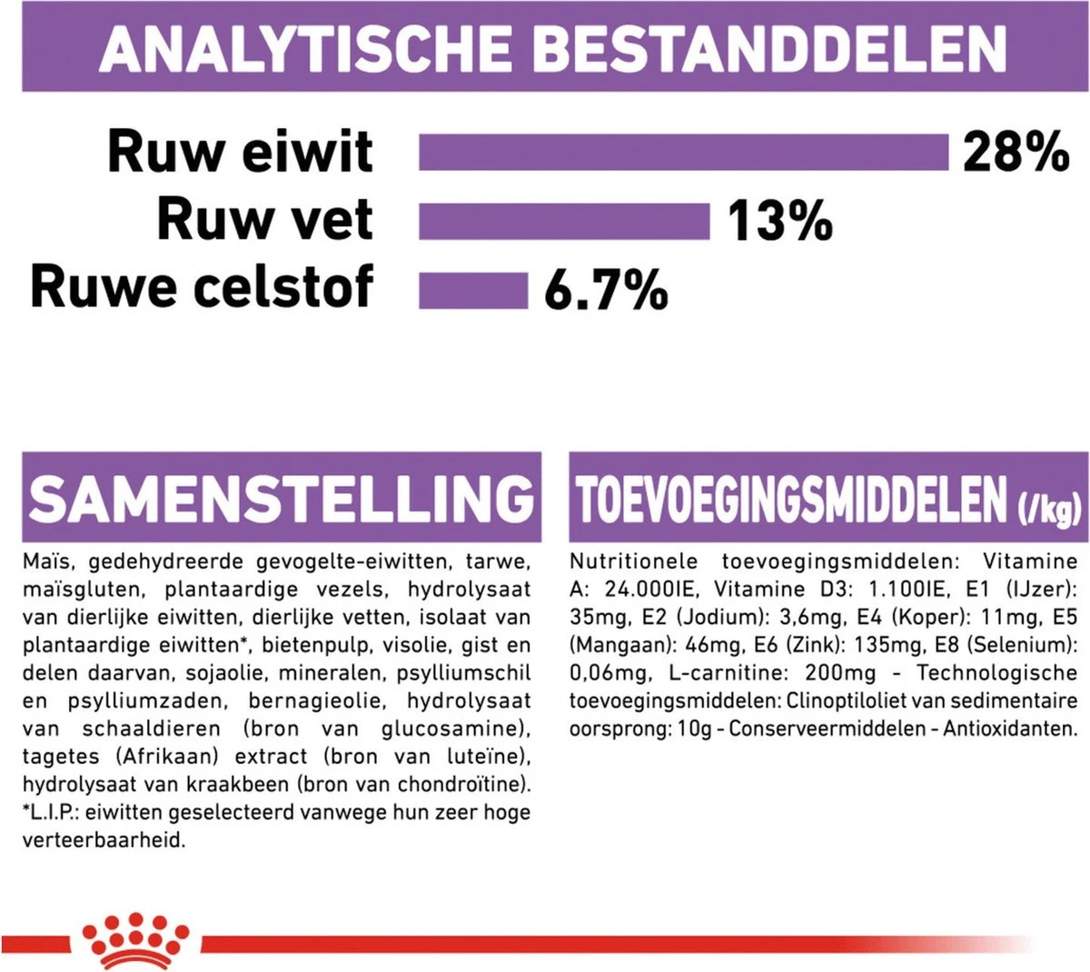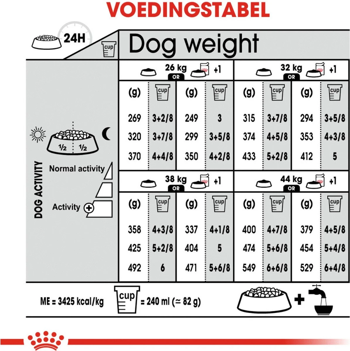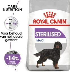 Voor gesteriliseerde/gecastreerde honden vanaf 15 maanden. Voor volwassen honden met een gewicht van 25kg tot 45kg Speciaal voor volwassen honden die gesteriliseerd of gecastreerd zijn De voedingsbehoeften van uw hond veranderen na de sterilisatie of castratie en zijn voeding dient hier op te worden aangepast. Met Maxi Sterilised biedt Royal Canin nu een eenvoudige en effectieve oplossing om uw hond voor de rest van zijn leven te ondersteunen. Het optimale gewicht behouden Sterilisatie of een castratie veroorzaakt veranderingen in de hormoonhuishouding van de hond. Het gedrag van uw hond kan hierdoor veranderen en zijn behoeften veranderen. Na de sterilisatie of een castratie heeft uw hond minder calorieën (energie) nodig als gevolg hiervan moet zijn dagelijkse hoeveelheid voeding aangepast worden om zijn optimale gewicht te behouden.