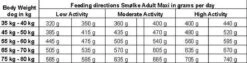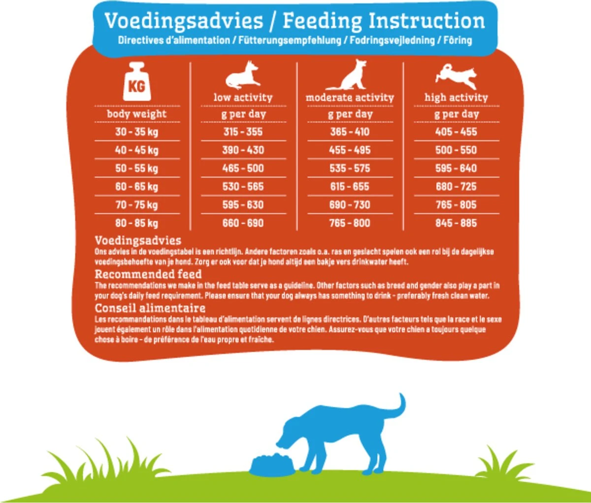 Ons advies in de voedingstabel is een richtlijn. Anderefactoren zoals o.a. ras en geslacht spelen ook een rol bij de dagelijksevoedingsbehoefte van je hond. Zorg er ook voor dat je hond altijd een bakjevers drinkwater heeft.