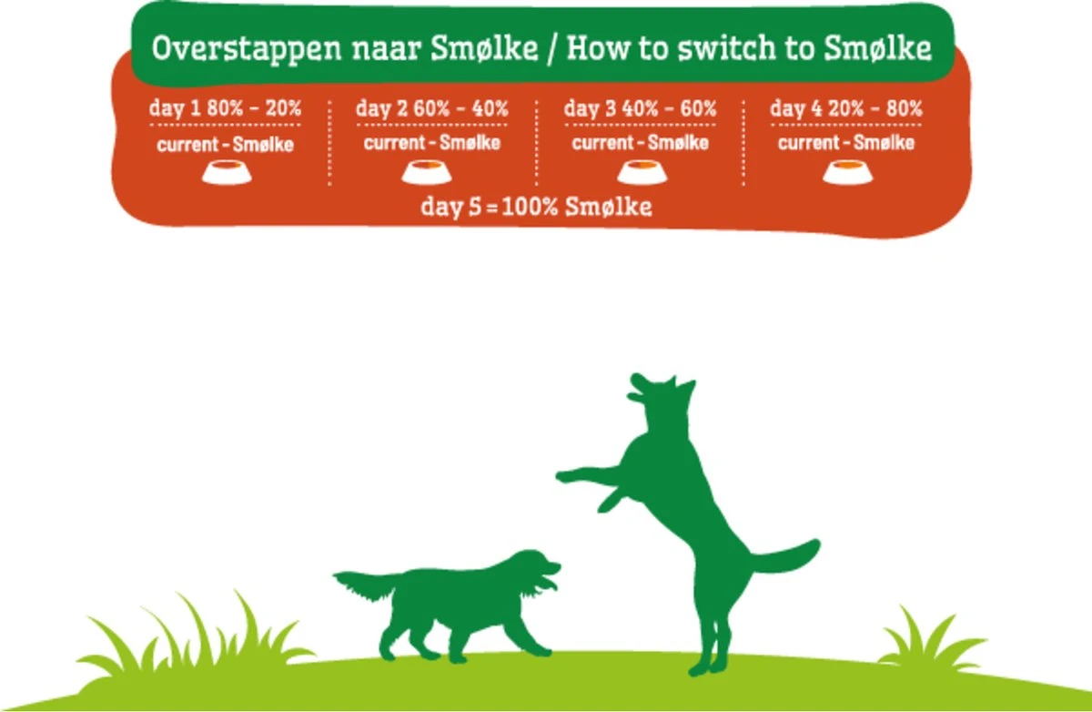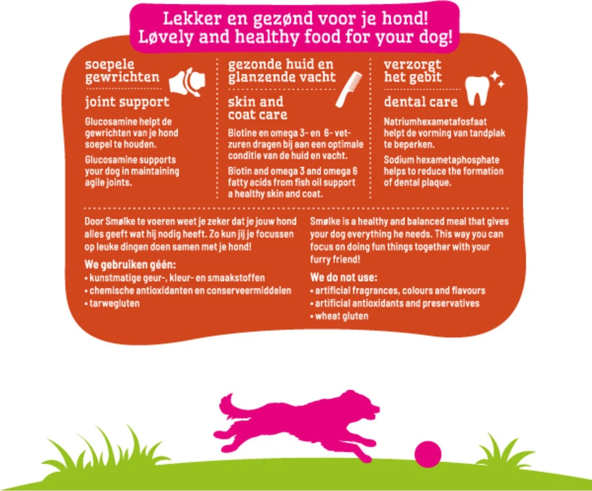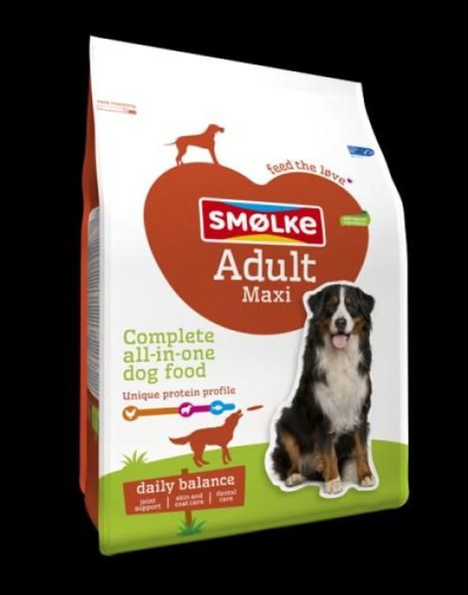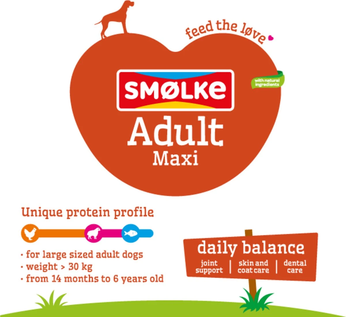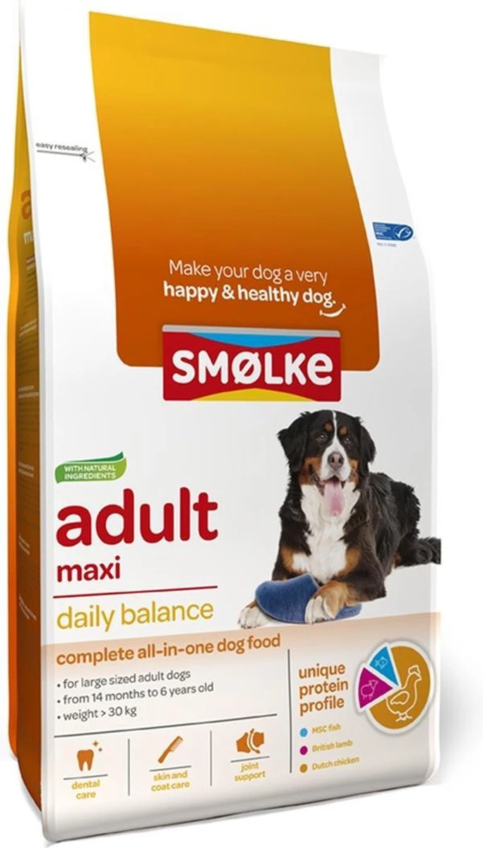 Smølke Adult Maxi is een complete Alles-in-één hondenvoedingafgestemd op de behoefte van grote volwassen honden vanaf ongeveer 14-18maanden en met een volwassen gewicht boven de 30kg. De voeding is samengesteldzonder tarwegluten en bevat glucosamine om te helpen je hond z’n gewrichtensoepel te houden. Smølke Adult Maxi is gemaakt met natuurlijke ingrediënten enheeft een uniek eiwitprofiel bereid met Nederlandse kip, MSC vis en Brits lam.Smølke Adult Maxi is een gezonde en gebalanceerde voeding die iedere dag weerzorgt voor een blije en tevreden hond. Natuurlijk zonder kunstmatige geur-,kleur- en smaakstoffen en chemische antioxidanten!