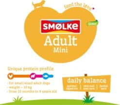 Smølke Adult Mini is een complete Alles-in-één hondenvoeding afgestemd op de behoefte van kleine volwassen honden vanaf tien maanden met een maximaal gewicht van ca. 10kg. De voeding is samengesteld zonder tarwegluten en is optimaal verteerbaar doordat o.a. (prebiotische) voedingsvezels de darmwerking ondersteunen. Smølke Adult Mini is gemaakt met natuurlijke ingrediënten en heeft een uniek eiwitprofiel bereid met Nederlandse kip, MSC vis en Brits lam. Daarnaast zijn de brokjes natuurlijk van klein formaat en érg smakelijk. Smølke Adult Mini is een gezonde en gebalanceerde voeding die iedere dag weer zorgt voor een blije en tevreden hond. Natuurlijk zonder kunstmatige geur-, kleur- en smaakstoffen en chemische antioxidanten!