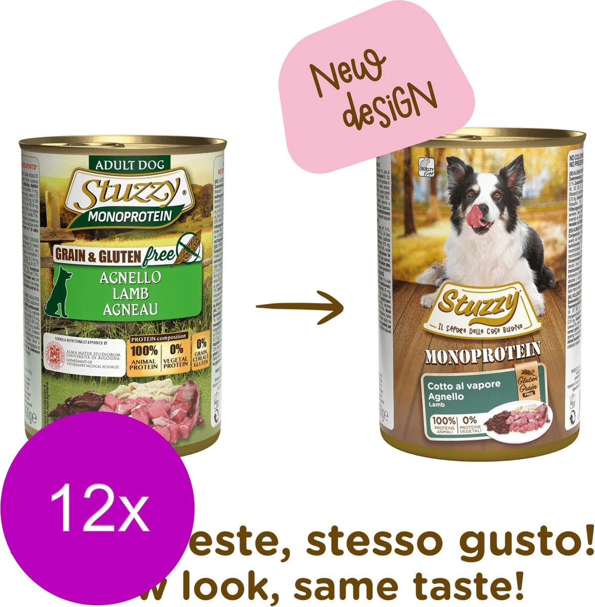 Dit natvoer van Stuzzy bevat maar één dierlijk eiwit en is graan- en glutenvrij, speciaal voor de gevoelige hond. Dit voer bevat geen kleurstoffen en conserveermiddelen.br /br /Samenstelling:br /Lam: 70%, lambouillon: 28,9%, mineralen: 1%, lijnzaadolie: 0,1%.br /br /Toevoegingsmiddelen:br /Vit. D3: 200 IE, zinksulfaatmonohydraat: 15 mg, mangaansulfaatmonohydraat: 3 mg, calciumjodaat watervrij: 0,75 mg, vit. E: 30 mg, vit. C: 40 mg, vit. B1: 13 mg, vit. B2: 6 mg, vit. B6: 3 mg, vit. B12: 75 ug, vit. B3: 17 mg, vit. B5: 12 mg, vit. B9: 0,6 mg, biotine: 300 ug.br /br /Analytische bestanddelen:br /Eiwit: 10,6%br /Vetten: 6,9%br /Ruwe as: 2,5%br /Ruwe vezels: 0,4%br /Vocht: 75%br /118 kcal/100g