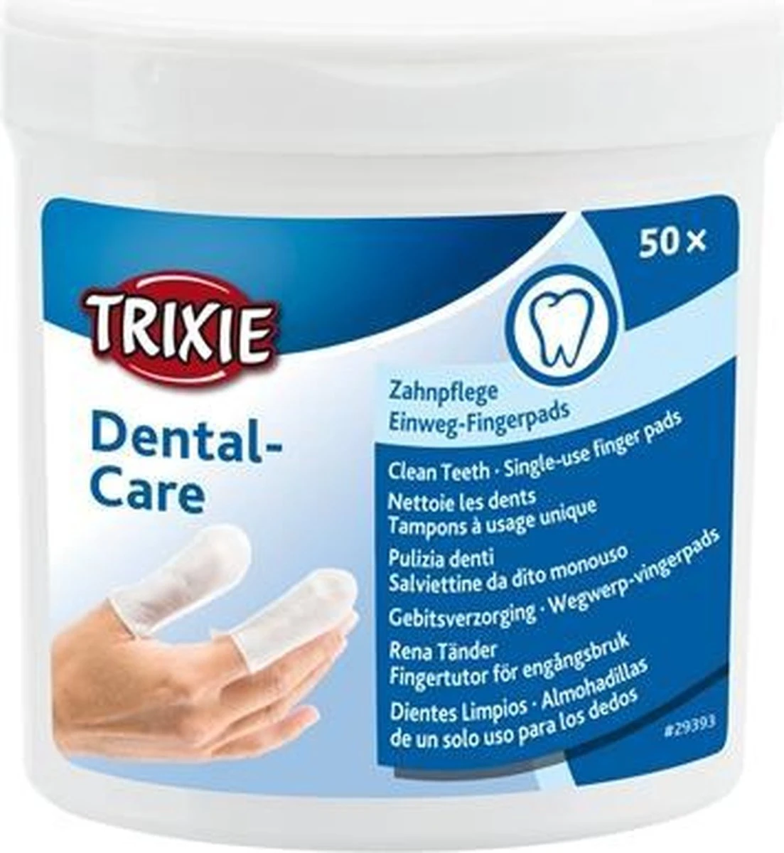 De Trixie Dental Care Vingerpads in 50 stuks zijn handige reiningspads voor honden, katten en andere kleindieren. Deze handige pads zijn al voorzien van verzorgende reinigingslotion op basis van munt. Je schuift ze simpelweg over de wijsvinger en duim schuiven en maakt het gebit voorzichtig schoon door over de tanden te masseren. Een perfect alternatief voor de tandenborstel en tandenpasta! De doekjes zijn gebruiksklaar en daardoor heb je ze altijd snel bij de hand.