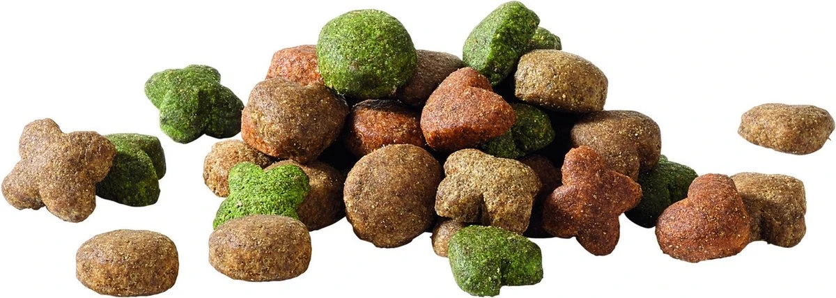 | Voedingswaarde | Samenstelling: Vlees en dierlijke bijproducten (16% lam in de bruine brokjes) / Granen (4% Rijst in de bruine brokjes) / Plantaardige bijproducten / Groenten (4% erwten in de bruine en groene brokjes en 0,5% wortel, 0,5% tomaat en 0,5% broccoli in de bruine brokjes) / Oliën en vetten (0,5% zalmolie) / Zaden / Mineralen / Gist / Vruchten (0,5% appel in de bruine brokjes) |