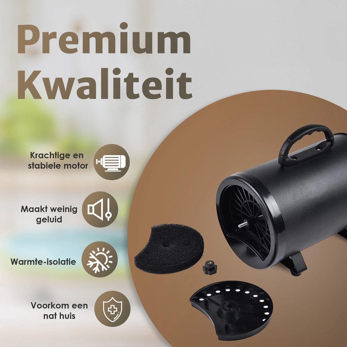 Een natte hond in huis hebben is niet plezierig: overal vieze pootafdrukken! Bovendien zijn honden, net als mensen, gevoeliger voor ziekte als ze langer nat blijven. Hem snel kunnen afdrogen is dus belangrijk. Bovendien bespaar je jezelf zo heel wat tijd die je anders kunt besteden aan lekker op de bank ploffen! De slang is prettig lang: wel 2 meter! Bovendien is deze gemaakt van een flexibele kunststof, zodat je gemakkelijk overal bij kunt, ook bij een hond die niet stil wilt zitten! Ook kun je de slang zo lekker strak oprollen. Sowieso neemt de waterblazer maar weinig ruimte in: hij is maar 20 bij 30 centimeter. Met de drie bijgeleverde opzetstukken kun je precies werken zoals jij dat wilt. Het spitse opzetstuk zorgt voor de krachtigste luchtstroom en is uitermate geschikt voor de dikkere vacht en precisiewerk. Met het platte opzetstuk kun je snel een groot oppervlakte droog maken. En is jouw hond nog nooit in aanraking gekomen met een waterblazer? Dan kun je je trouwe viervoeter eraan laten wennen door op de zachtste stand te beginnen en gebruik te maken van het ronde opzet stuk. Deze verdeelt de lucht meer en voelt daarom zachter aan. Daarnaast kun je ook de warmte van de luchtstroom instellen, zodat jouw hond zich altijd comfortabel voelt. Let wel op: de koude stand wordt beïnvloed door de kamertemperatuur. Bij een koudere kamertemperatuur is de lucht die de fohn uitblaast ook kouder. Tot slot heeft deze degelijke hondenblazer een CE certificering, bewijs van een oerdegelijke kwaliteit!